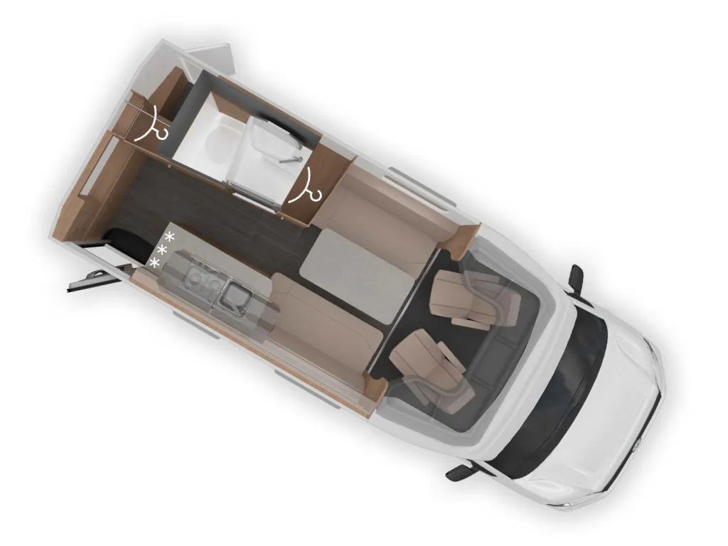 | Face-to-Face Sitzgruppe | Mobile Stauraumboxen - Einteilung: Küche I | | Bettumbau der Sitzgruppe | Mobile Stauraumboxen - Einteilung: Schlafen I |