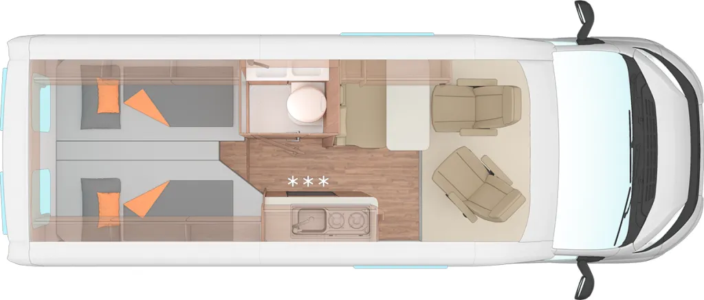 | Seitenwände mit atmungsaktiver Stoffbespannung | Linkslenker | | Scheinwerfer mit schwarzem Rahmen | Kältebrückenoptimierte Isolation |