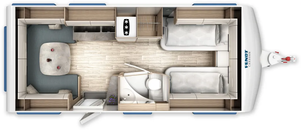 | Teppich im Türeinstieg mit Fendt-Caravan Schriftzug | Winterrückenlehnen |
