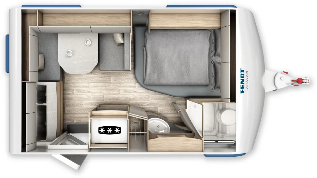 | Teppich im Türeinstieg mit Fendt-Caravan Schriftzug | Winterrückenlehnen |