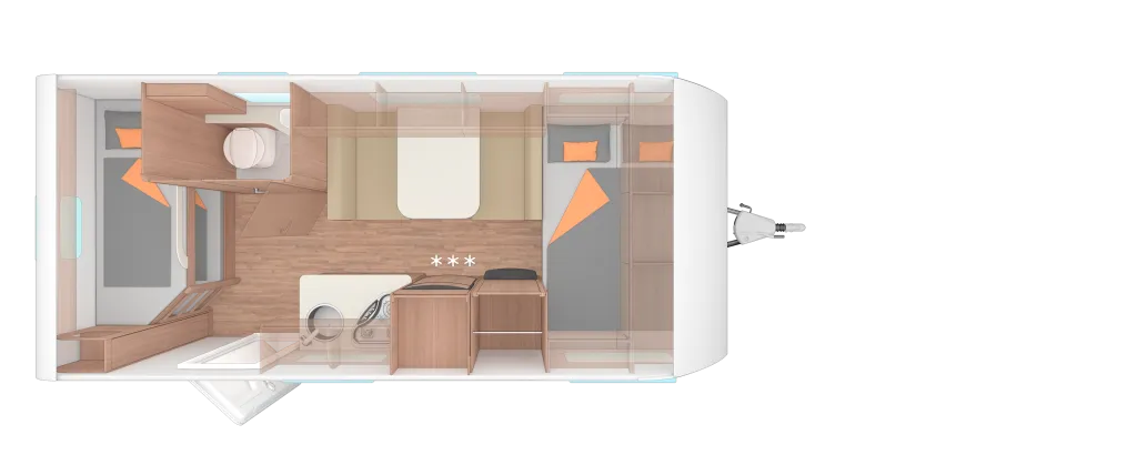 | Gasheizung: Truma Heizung S 3004 bis 550 QDK (Truma S 5004 bei 740 UDF) mit Piezozündung | Gasregler | | Frischwassertank 15 Ltr. | Wasserversorgung mit Tauchpumpe 12V |