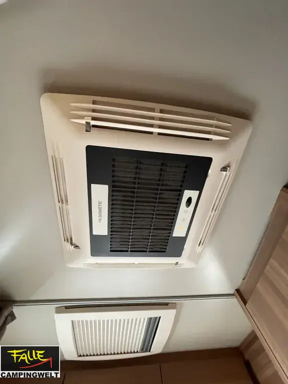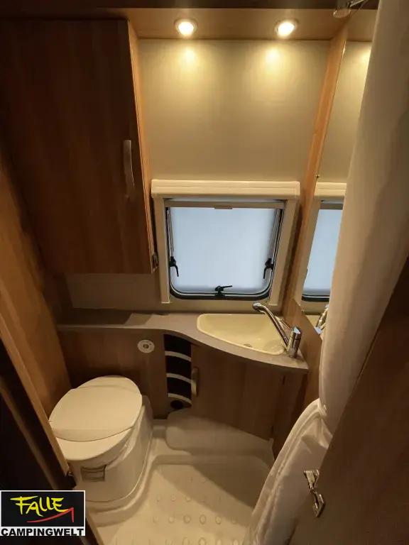 | Dometic Keramik-Kassetten-Toilette | Eckwaschbecken mit Holz-Waschtisch; mit Spiegel | | Holzschrank mit Ablagen | Duschausrüstung optional erhältlich |