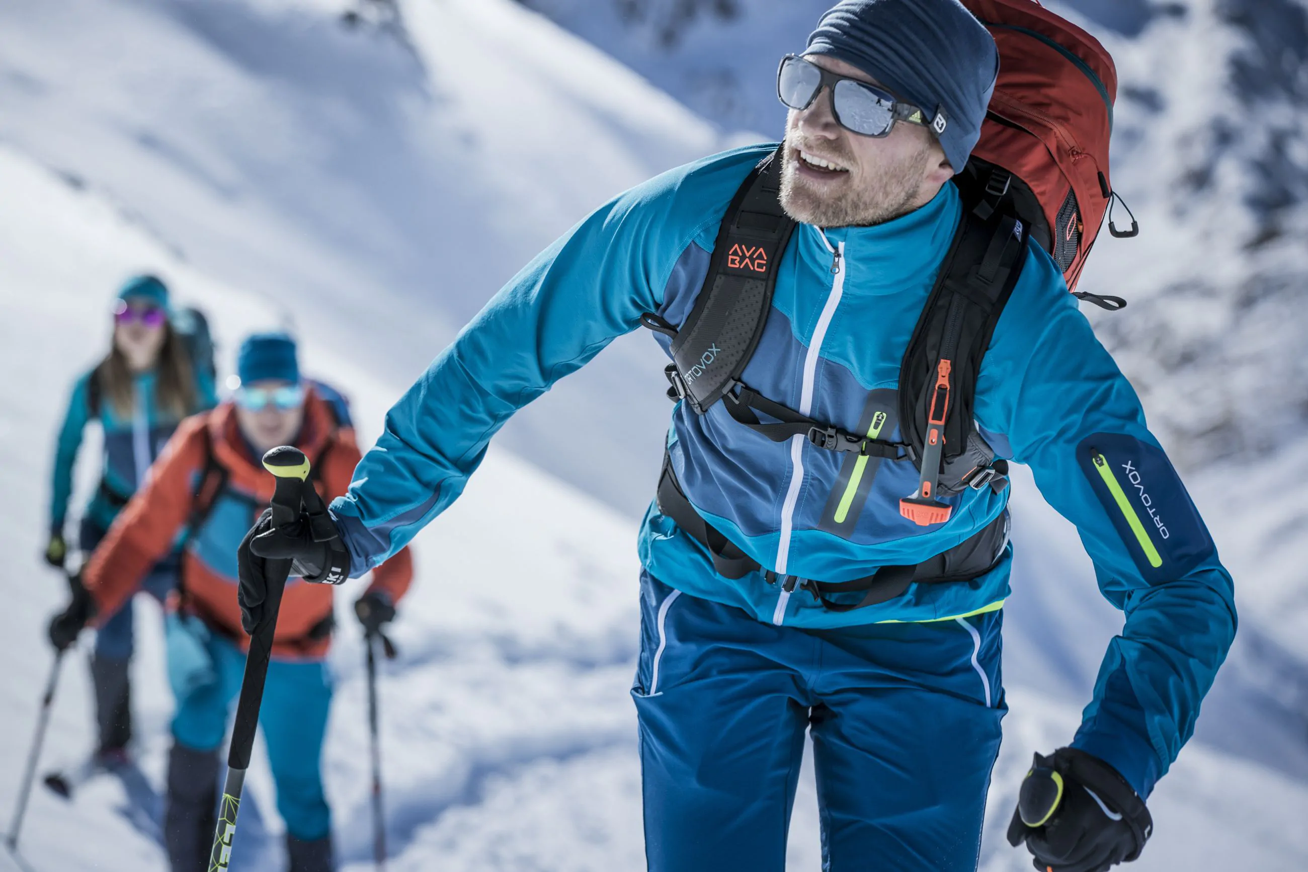 Powderabfahrten, Zeit mit Freunden, Gipfelerlebnisse. Ermöglicht durch pure Funktionalität der Ortovox Technologien.
